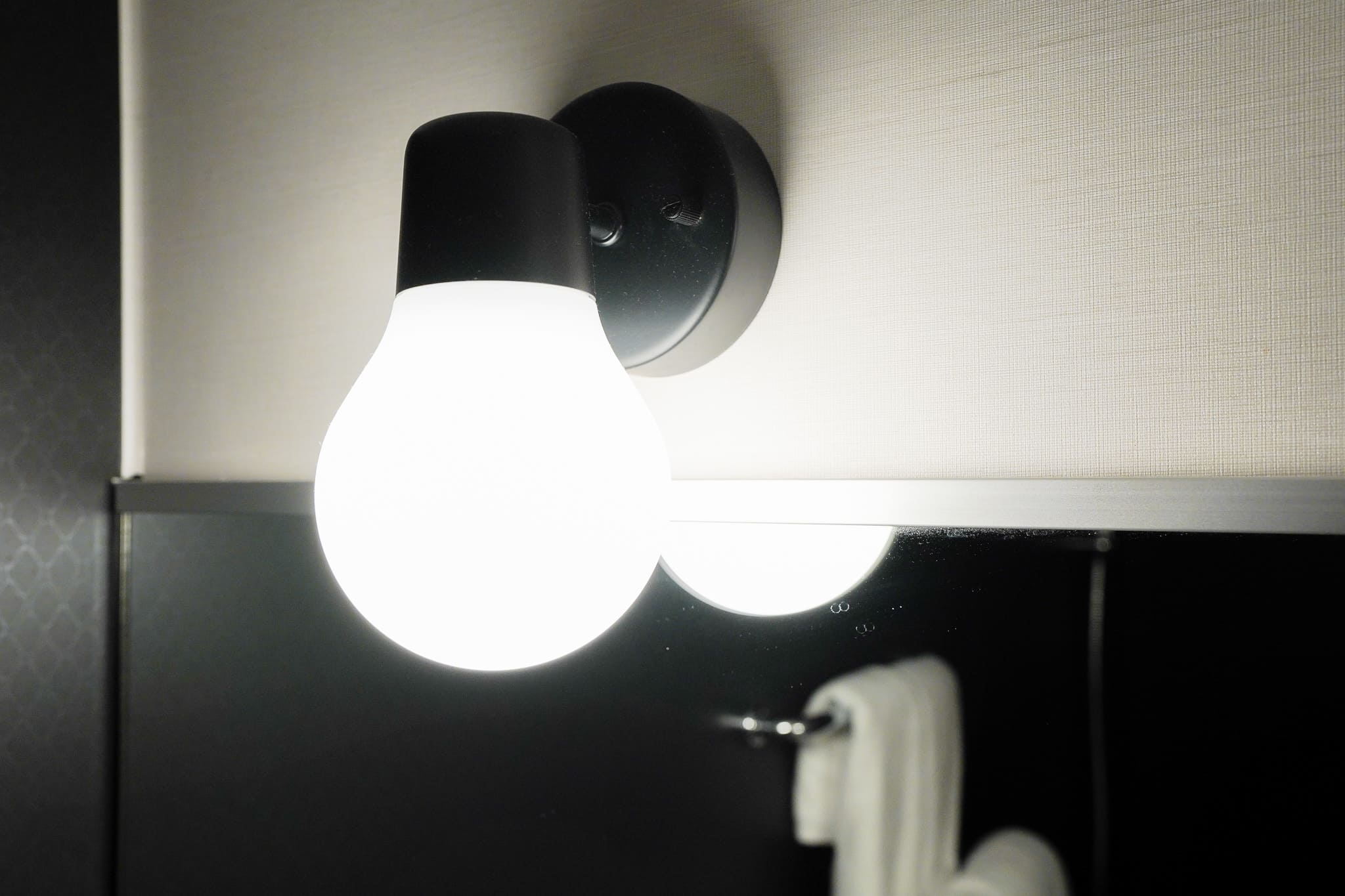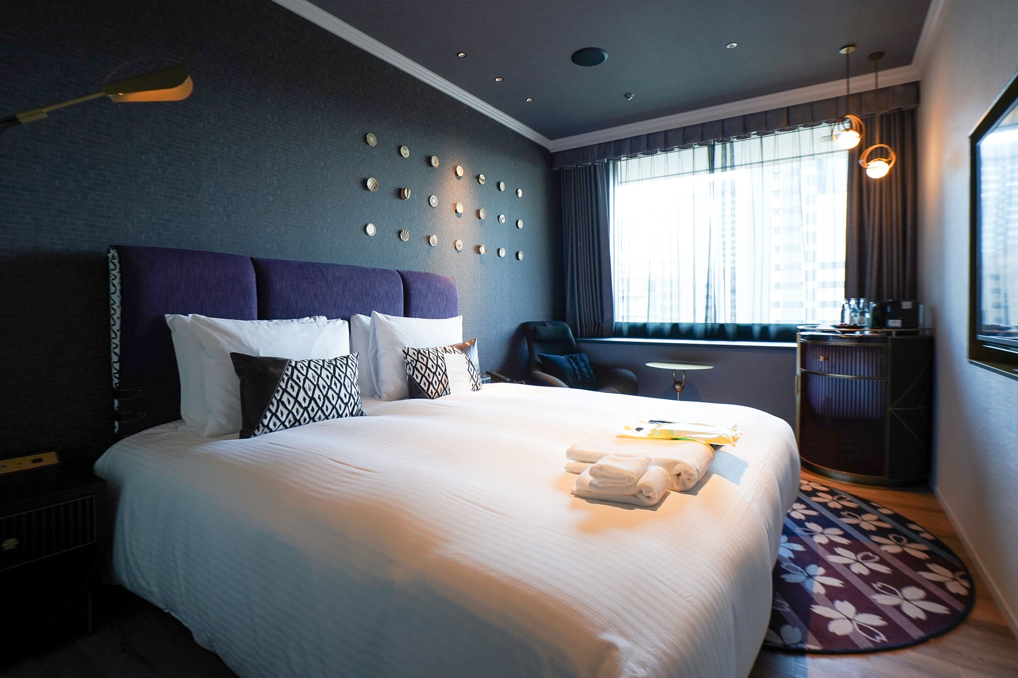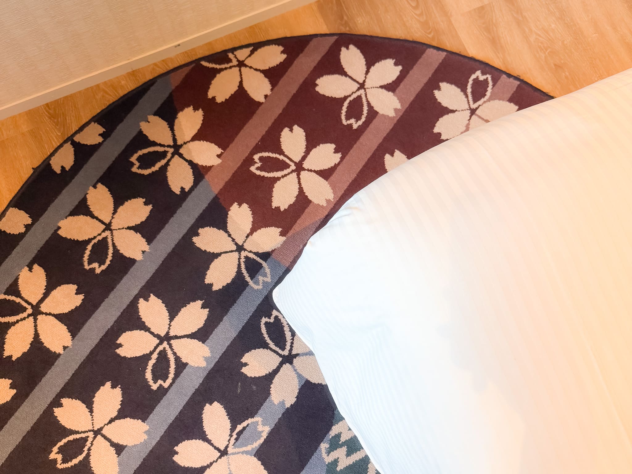 シックなカラーを基調とした客室は、壁のオブジェやデザイン性の高さが特徴的なインテリアライト、日本を感じられる桜のデザインのマットなどが素敵なアクセントになっています。