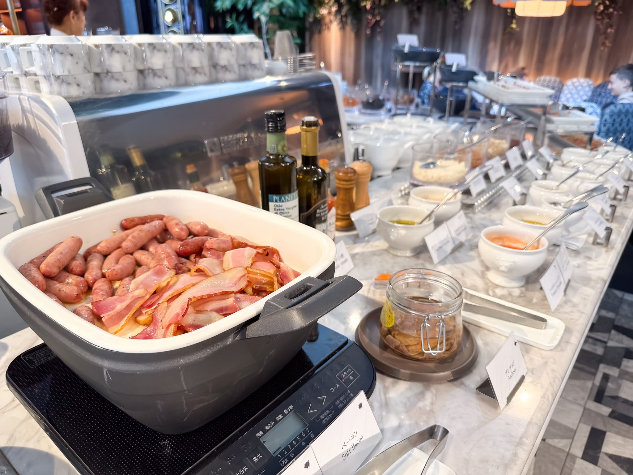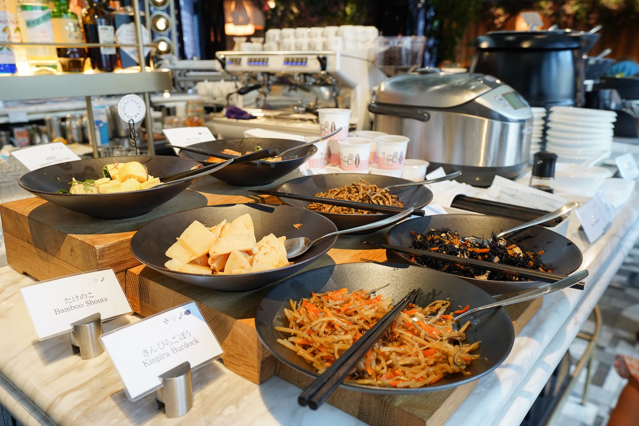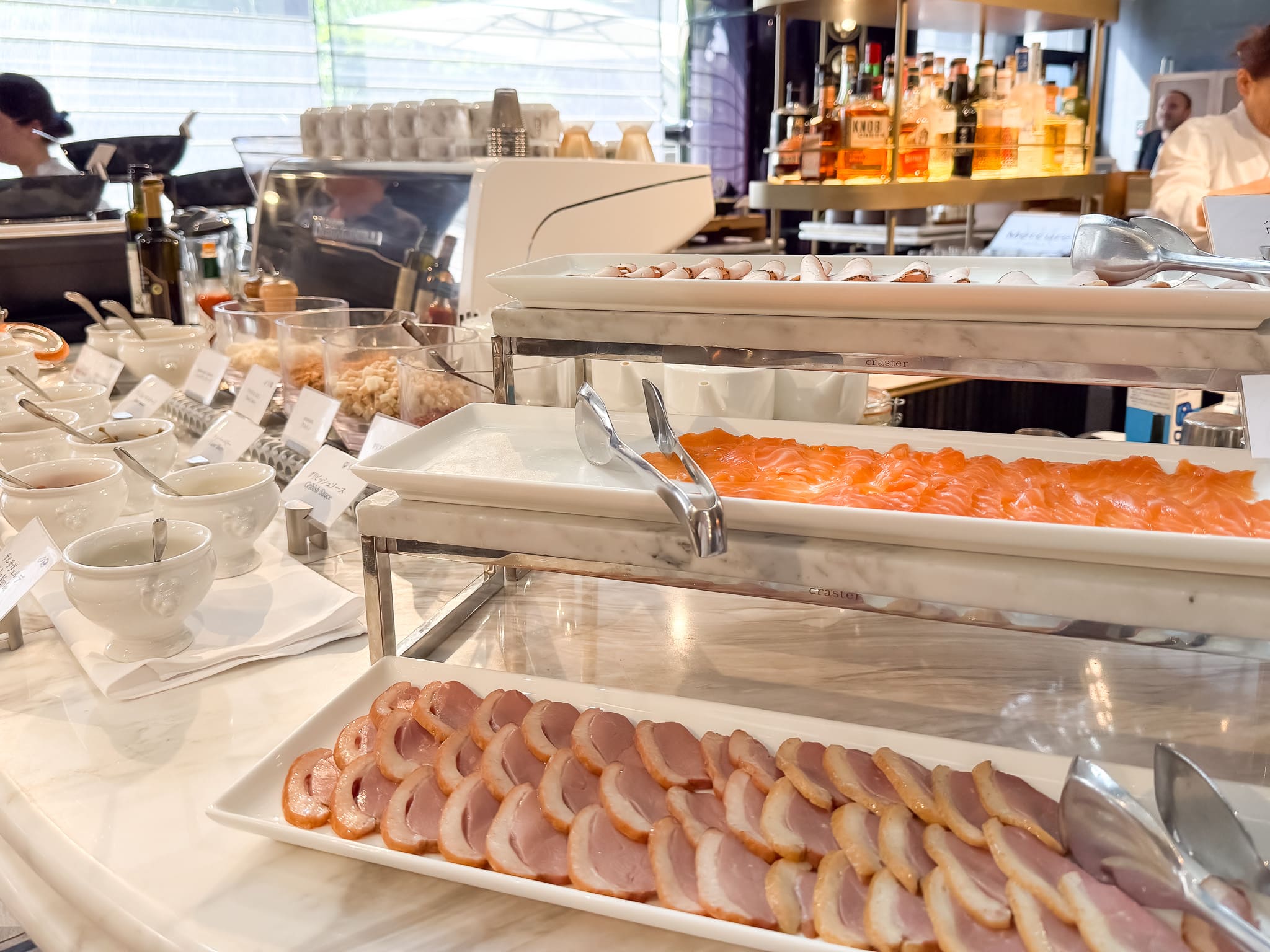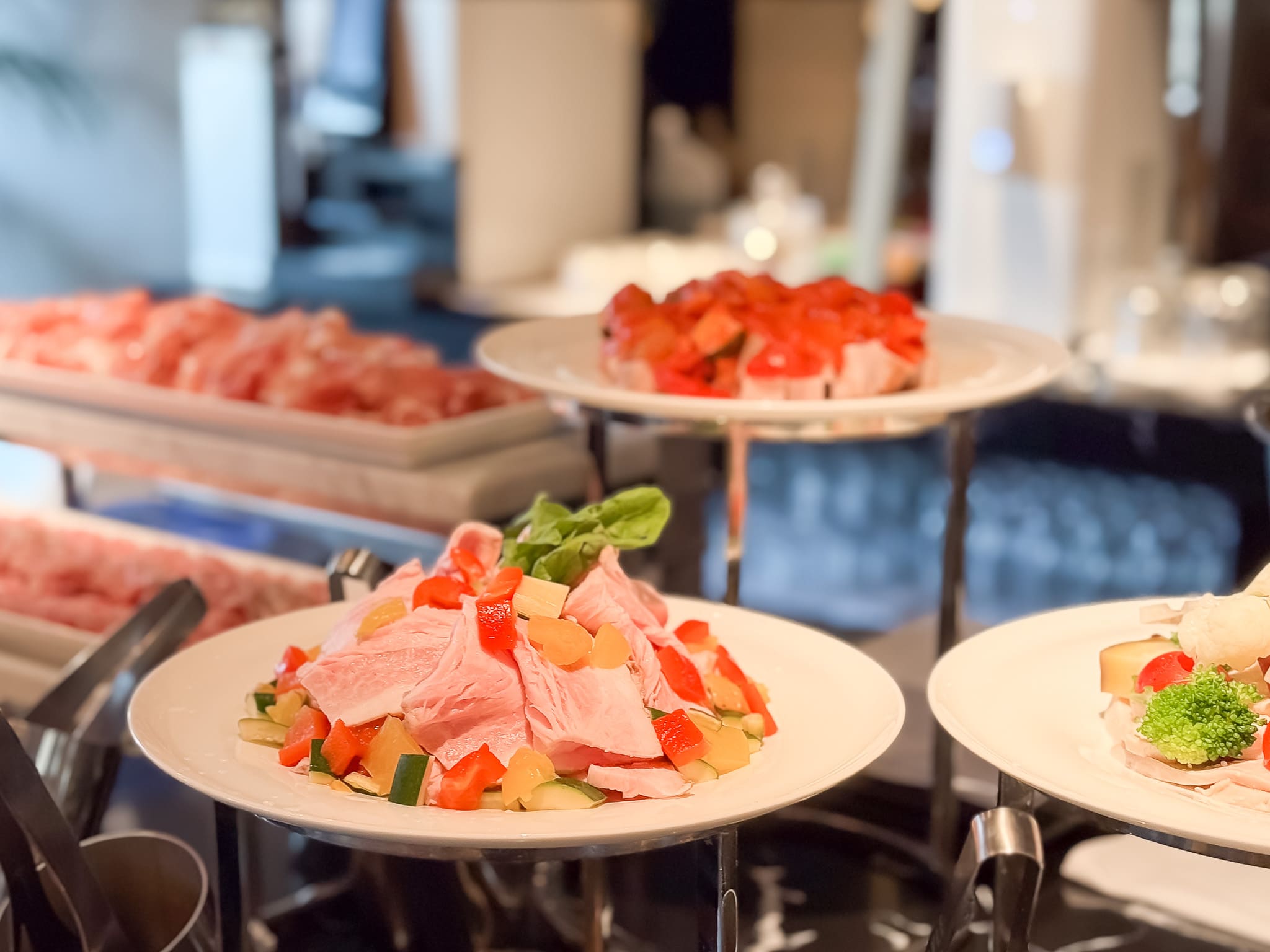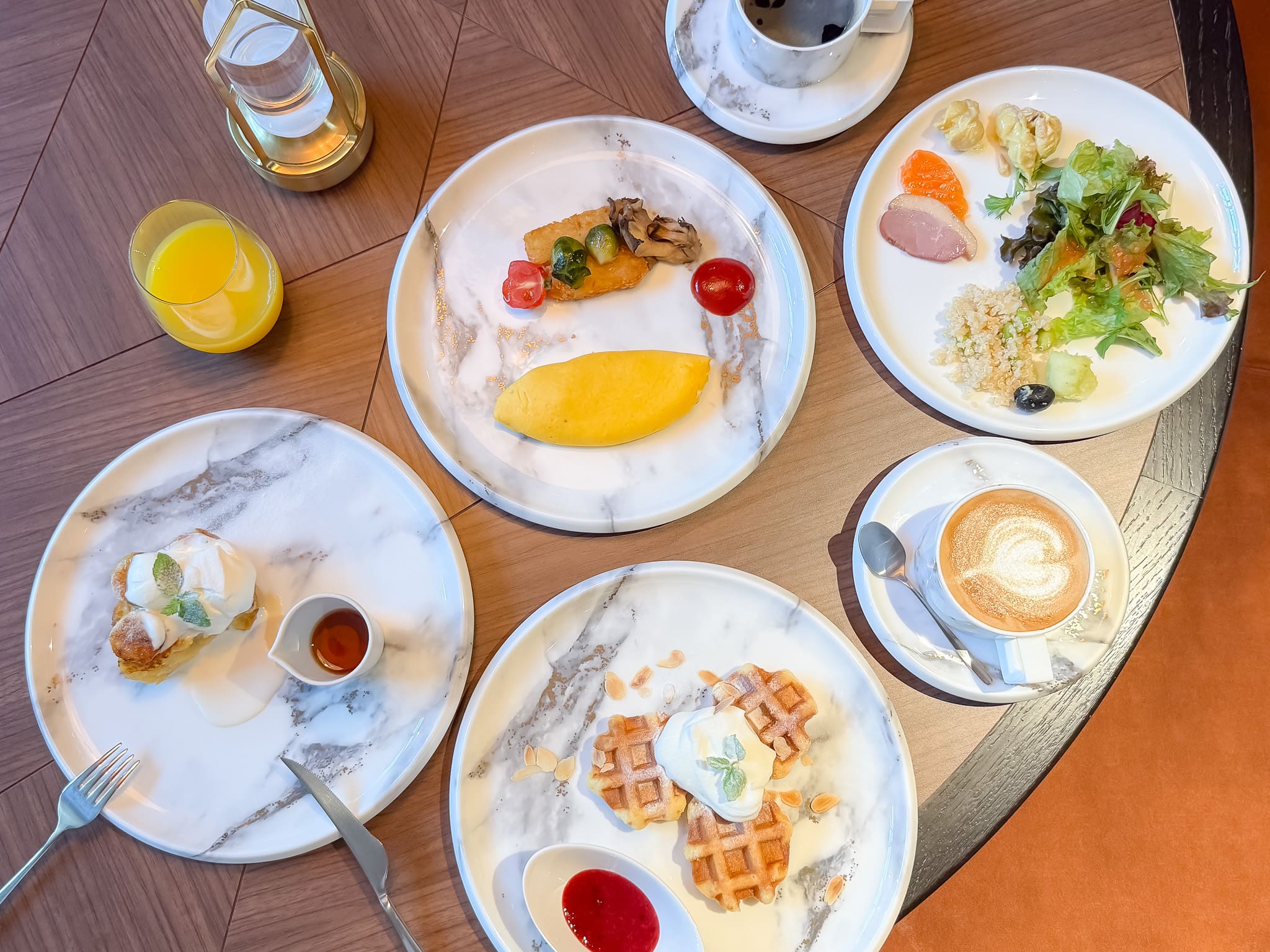 朝食はハーフビュッフェスタイルで、前菜やフルーツなどはビュッフェ台から自由に。