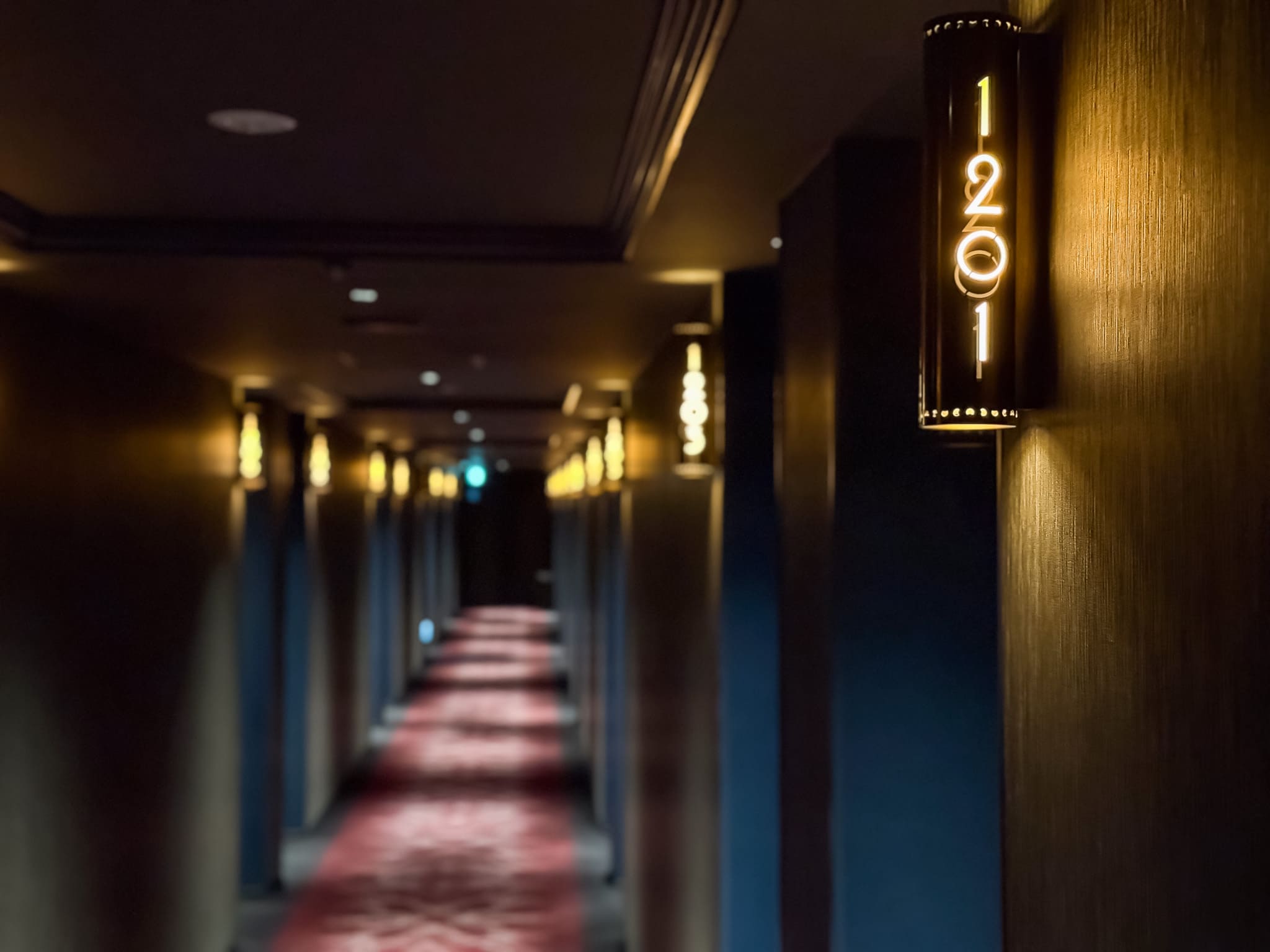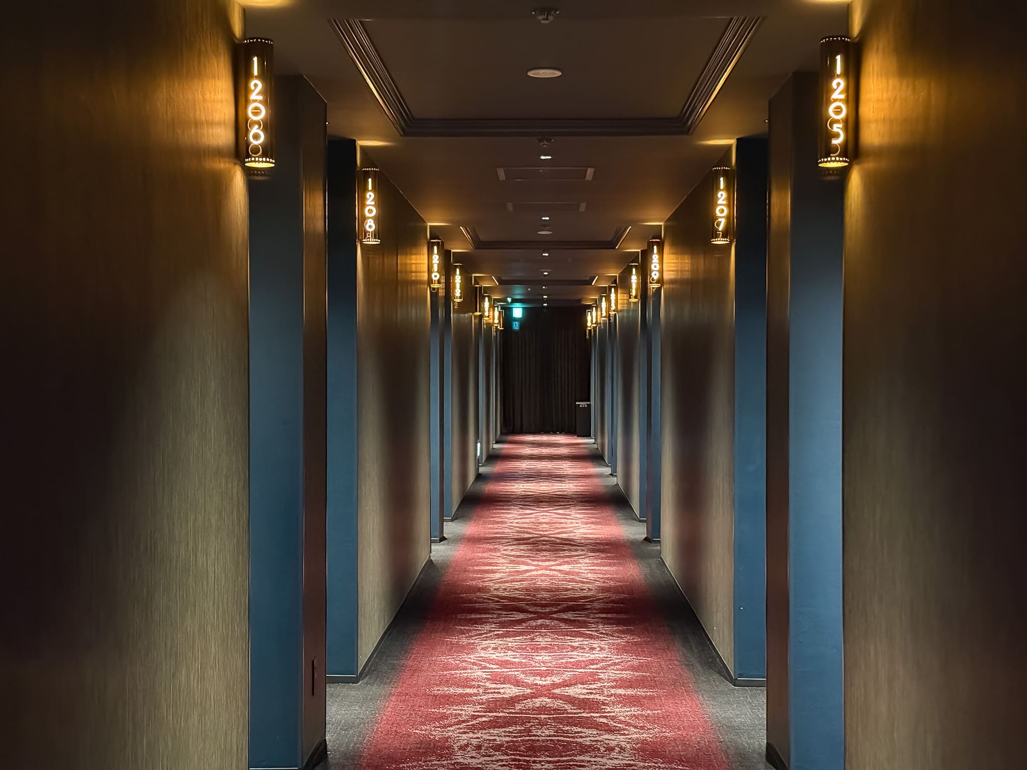 映画フィルムをモチーフにした、レトロな部屋番号が並ぶ素敵な客室廊下。